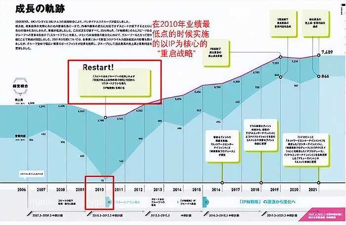 2010年,万代南梦宫启动“重启计划”,对组织架构进行了大刀阔斧的调整。为了更好地进行业务协同,公司不再以业务内容进行竖向分割,而是采用了以IP为轴的横向联手协作,让IP从最初环节的玩具、电影、扭蛋,再到二度创作的实景表演、游戏等环节,共同企划、开发、执行,将IP价值最大化、IP发展生态化。