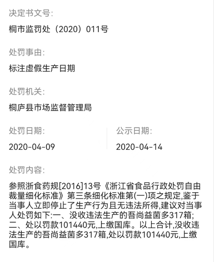 值得注意的是,启信宝APP显示,早在2020年4月9日,当地市场监管部门就曾对吾尚食品有限公司标注虚假生产日期的行为进行了处罚,没收违法生产的乳制品300多箱,罚款10万余元。