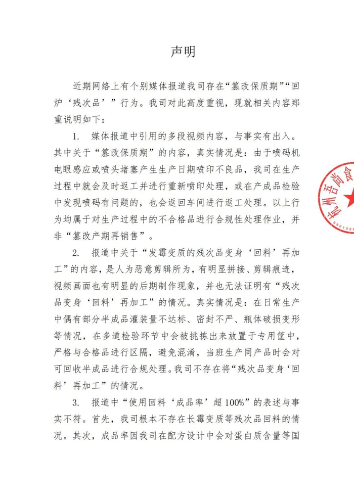 1.媒体报道中引用的多段视频内容,与事实有出入。其中关于“篡改保质期”的内容,真实情况是:由于喷码机电眼感应或喷头堵塞产生生产日期喷印不良品,我司在生产过程中就会及时返工并进行重新喷印处理,或在产成品检验中发现喷码有问题的,也会返回车间进行返工处理。以上行为均属于对生产过程中的不合格品进行合规性处理作业,并非“篡改产期再销售”。