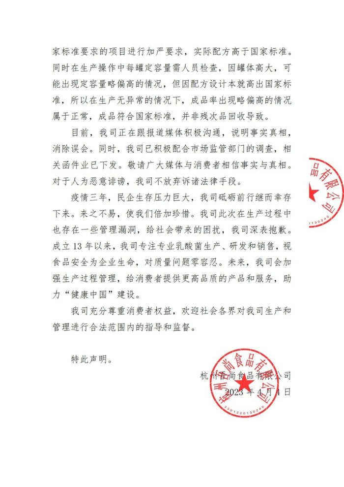 同时,我司也尊重消费者权益,欢迎社会各界对公司生产和管理进行合法范围内的指导和监督。希望消费者莫被不实报道欺骗,公司成立13年以来专注专业乳酸菌生产、研发和销售,多次获得国家及行业认证,实实在在做产品,踏踏实实做企业。