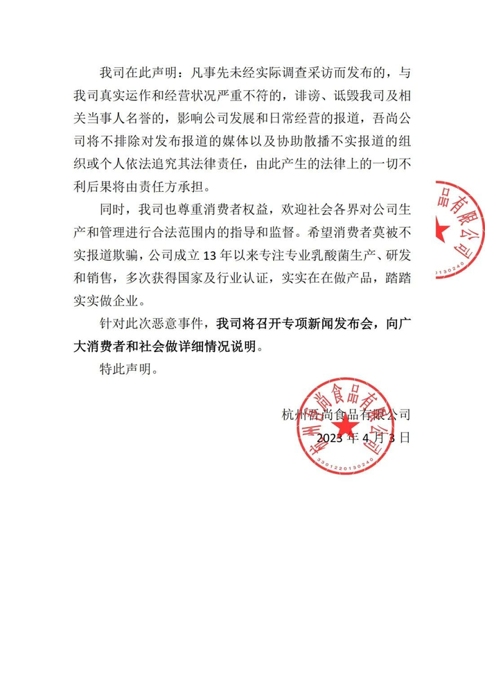 4月3日晚上,吾尚食品官方公众号发布一则声明函,其中提到: