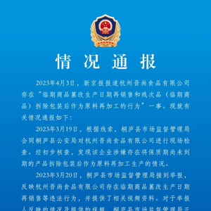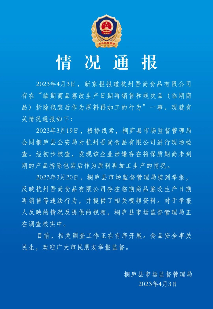 据桐庐市场监督管理官微消息,2023年4月3日,新京报报道杭州吾尚食品有限公司存在“临期商品篡改生产日期再销售和残次品(临期商品)拆除包装后作为原料再加工的行为”一事。现就有关情况通报如下: