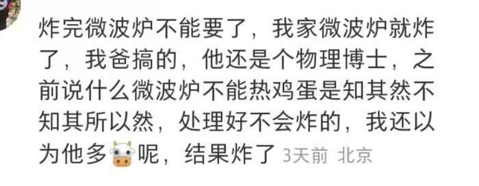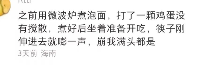 评论区一时间挤满了微波炉热鸡蛋的受害者,有人被鸡蛋崩了一头一脸,有人哭着擦了微波炉一晚一宿。
