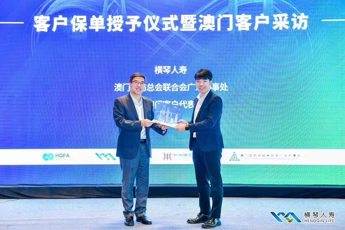 横琴人寿总裁黄志伟(左)为澳门街坊总会广东办事处副主任禤绍生送上合作区纪念保单