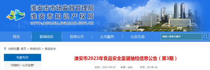 江苏省淮安市市场监管局发布2023年第3期食品安全监督抽检信息