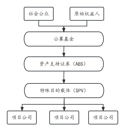 由于国内的REITs尚在试点过程中,其设立及运行需要在现行证券基金相关法律制度框架下运行,因此产生了一些自身特点和独特模式。由于现行《证券基金投资法》第72条规定:“基金财产应当用于下列投资:(一)上市交易的股票、债券;(二)国务院证卷监督管理机构规定的其他证券及衍生品种。”因此,国内REIT无法直接对项目公司进行投资,而要在中间架设一层资产支持证券(ABS),从而形成下图所示的架构,其中SPV通常在设立阶段存在,随后被反向吸收合并。