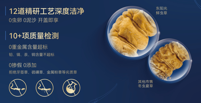 在产品工艺方面,东阳光鲜虫草采用了10+项质量检测,从源头上确保每一根东阳光鲜虫草都做到0重金属含量超标、0添加、0掺假,同时搭配12道精研工艺深层洁净,有效清除冬虫夏草虫体沟壑处残存的泥沙、虫卵等杂质,让每一根东阳光鲜虫草都可以免洗鲜着吃,让消费者吃得更加安心。