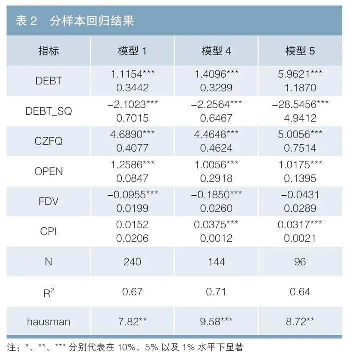 其中,α为截距项,μ表示个体固定效应,ε为随机误差项,DEBT_SQ为地方政府债券规模的平方项,X为被引入控制变量,β、θ分别为地方政府债券规模一次项、二次项关于经济增长的作用系数。如果θ=0,则地方政府债券规模与经济增长之间是一种线性关系。反之,地方政府债券规模与经济增长是一种非线性关系,在此情况下,当θ>0时,显示地方政府债券规模对经济增长作用关系表现为先下降、后上升的U形;当θ<0时,有关作用关系表现为先上升、后下降的倒U形。