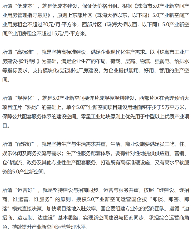 其中特别是低租金,要求了“原则上东部片区(珠海大桥以东)5.0产业新空间产业用房租金平均不超过20元/月·平方米,西部片区(珠海大桥以西)5.0产业新空间产业用房租金平均不超过15元/月·平方米。”