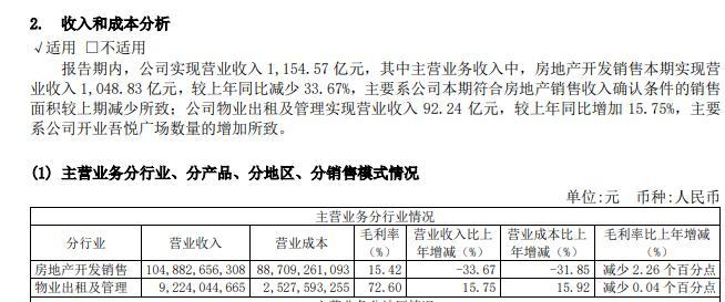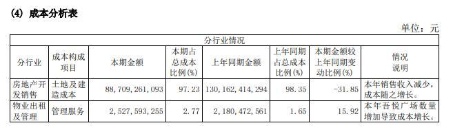 第二来源是物业出租及管理,该部分实现营业收入92.24亿元,较上年同比增加15.75%,主要系公司开业吾悦广场数量的增加所致。