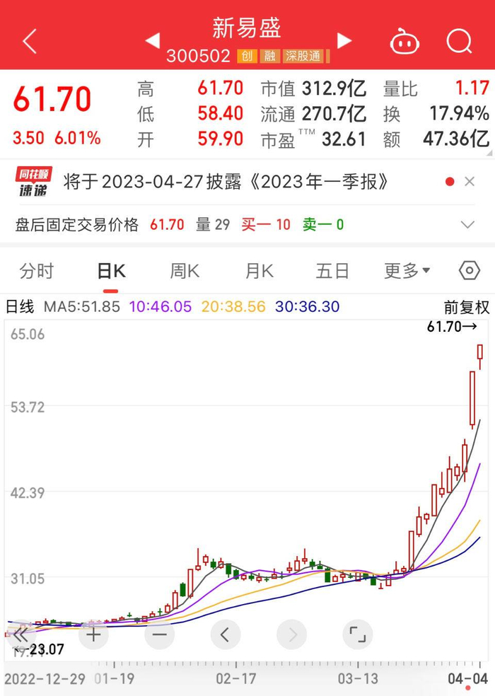 记者注意到,在一众概念股中,新易盛表现亮眼。据公开信息,新易盛主要从事CPO(共封装光学)技术下的光模块的研发、设计、测试和销售,而CPO与AIGC领域深度关联,按照AIGC的发展态势,当前智算算力需求未来将进一步放大,所以CPO需求也会增长。4月3日,新易盛录得20cm涨停,4月4日,新易盛又上涨了6.01%,报61.70元/股,创下历史新高。近一年,公司股价累计上涨高达105.14%。