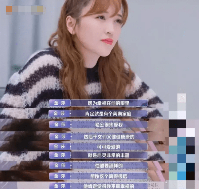 金莎曾在一档综艺节目上听到爸爸在结婚这件事情上对自己的理解和担忧之后,忍不住哭了。在节目中她哽咽着说:“看到这个视频我觉得很惭愧,对我来说,我不知道怎么去勉强自己。站在爸妈的角度上我又觉得我给他们造成了很多的缺失。但是我没有办法不对自己未来的幸福负责,而去随意地嫁人。”