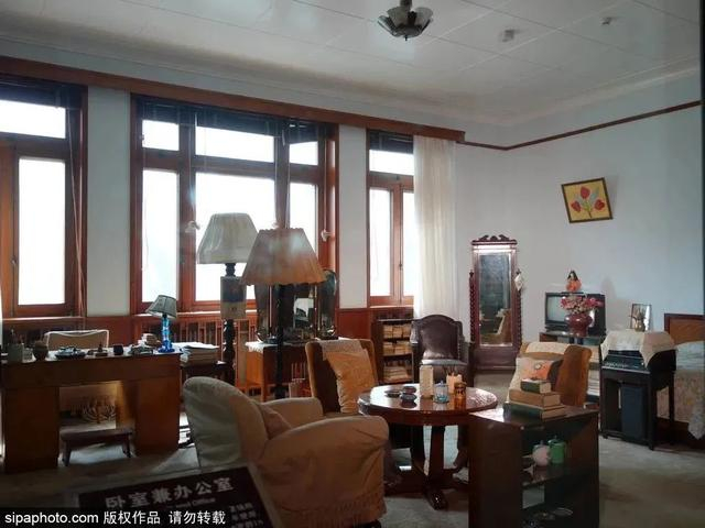 客厅东面与郭沫若办公室相接。一排书柜依西墙而列,书柜上方横挂着毛泽东的真迹《西江月·井冈山》。对面是郭沫若夫人于立群的隶书中堂,录毛泽东词《沁园春·雪》。办公室东边的小门通向卧室:一部百纳本的《二十四史》伴着一张棕绷床,绿格子的床单使小屋显得朴素宁静。