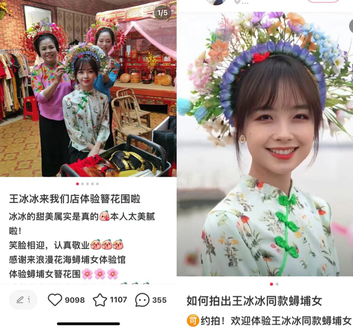 在直播预热片发布后,小红书上就开始有人求打卡冰冰同款簪花围,后来前去体验蟳埔女装扮的和游客络绎不绝,泉州从早到晚都流淌着“移动的花海”,许多女生都要get“冰冰同款簪花围和冰冰同款照片”,甚至在拼多多上还出现了冰冰簪花围手工艺品平替。