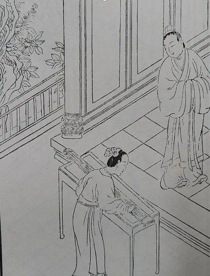 明代的琴桌很大程度上以宋制为圭臬。明万历年间《仇英列女传》“百里奚妻”版画插图中的琴桌亦为四平面式,桌面长方平直,四腿为方材,直落到地,有内翻勾云蹄足。杜堇《听琴图》中,也有类似的琴桌,四面平直,方腿,桌面嵌以石板或木材,细部处理微妙。上海博物馆所藏明黄花梨楠木面夹层音箱两卷角牙琴桌,以及大英博物馆所藏的明红柒四平面夹层音箱琴桌,皆个中典范。