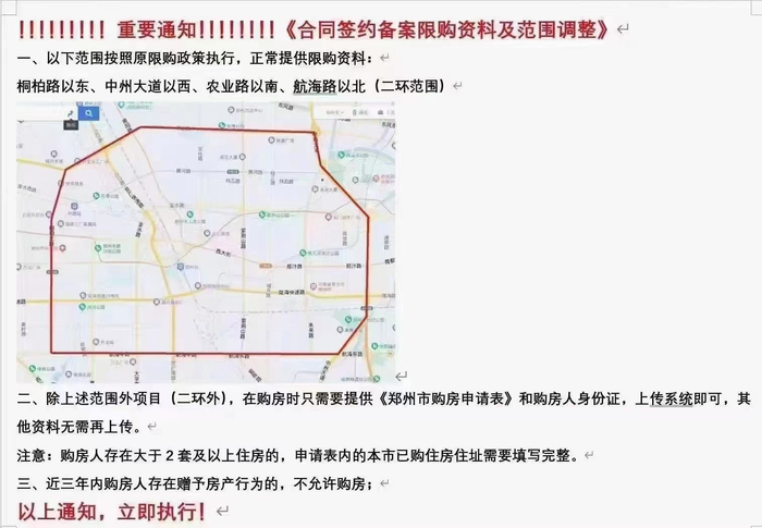 4月3日,据多家媒体报道,郑州市将从本周开始执行新的限购区域调整,二环外将取消限购政策。此次限购调整范围为航海路以北,桐柏路以东,农业路以南,中州大道以西,以此为二环限购范围,限购范围内依旧执行每个家庭2套住宅的限购政策。