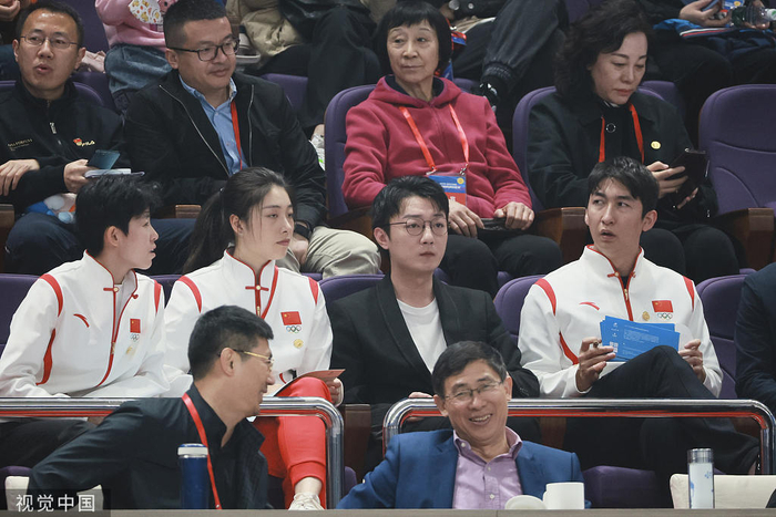 电视剧《狂飙》中饰演高启盛的演员苏小玎(右二)坐在武大靖身边。