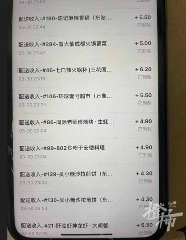 23点03分-23点05分,小黎一共有6笔配送收入到账。很多外卖小哥为了效率,遇到顺路的会一口气接几笔订单,小黎一口气接了6笔外卖单,最高一单收入6.2元,最低的4.3元。