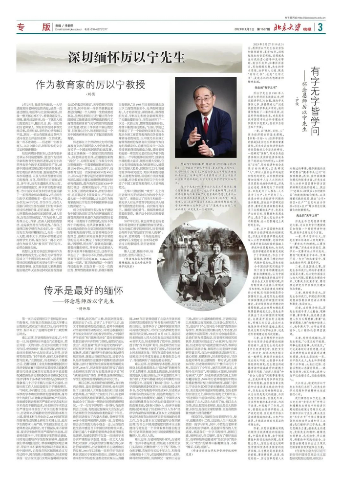 清明之际,在此刊发《北京大学校报》追思文章,深切缅怀、致敬我们敬爱的创始院长厉以宁先生。先生之风永远铭刻在我们心中,激励我们前行。