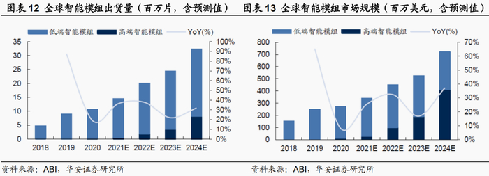 2021年智能模组渗透率约3.75%,根据ABI Research数据预测,到2024年,全球智能模组合计出货量有望突破3200万片,对应市场规模约7.2 亿美金。其中高端智能模组应用迅速增加,2020-2024年出货量复合年均增长率达到150%,有望突破800万片,市场规模超过4亿美金。