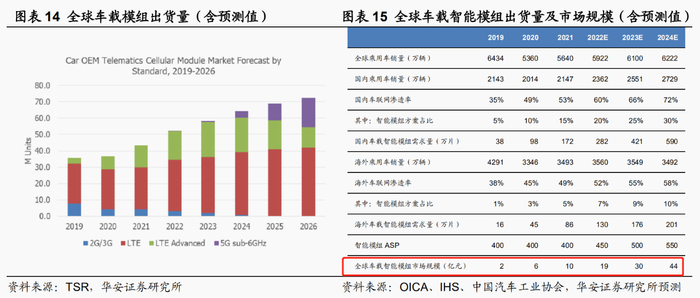 智能模组在我国车载模组市场需求旺盛。TSR数据显示,2021年全球车载模组出货量约4300万片,仍以4G/5G数传模组为主,根据OICA、中国汽车工业协会以及HIS等数据,华安证券保守测算到2024年,海外车载智能模组需求量约200万片、国内车载智能模组需求量约590万片,若按届时智能车载模组ASP 550元人民币计算,则2024年全球车载智能模组市场规模为44亿元人民币,6年增长22倍。
