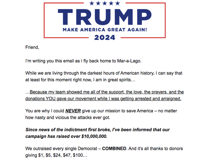 而过去几天,特朗普的竞选团队抓住机会,几乎每个小时都在发送筹款邮件。在结束审讯离开纽约后,特朗普就向支持者写道:“我在飞回海湖庄园的家中给你们写这封邮件。我们正在经历美国历史上最黑暗的时刻,我可以说至少在这一刻,我精神振奋...... 因为我的团队向我展示了你们在我被捕和传讯时,给予我们的竞选所有的支持、爱、祈祷和捐款。”