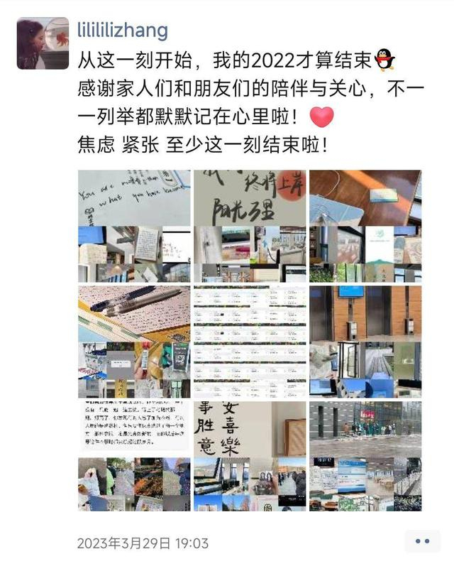 张莉在朋友圈中写道:“从这一刻开始,我的2022年才算结束。焦虑、紧张、至少这一刻结束啦!”谈到这样写朋友圈文案的原因,她说:“我是跨考,总觉得不如科班出身的学生,因此自己一个人在宿舍里拼命学习。由于备考时间主要在2022年,所以很感谢2022年的自己,那个虽然走得很慢但是一直前行的自己。”