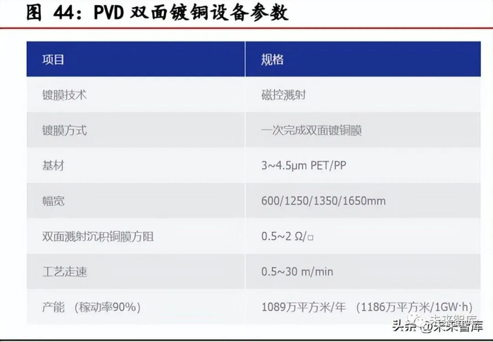 复合铜箔业务:复合铜箔领域来看,目前公司磁控溅射设备已实现量产。根据公司官网, 公司研发的超薄复合铜箔卷绕镀膜设备,实现在厚度3.0-4.5μm,幅宽0.6-1.65mPET/PP 塑料薄膜表面一次完成双面镀铜膜,设备工艺走速0.5-30m/min,方阻0.5-2Ω,设备良 率90%,产能达到1089万平/年。