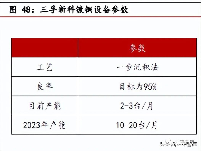 一步法关键假设:1) 情景一:实现小规模生产(产能利用率为50%),良率达到90%的情况。1、工作时间:工作天数为300天/年,工作时间为16小时/天,年小时数为4800小时。2、药水:假设药水成本为3元/平。3、设备:由于公司设备暂未定价,假设化学镀铜设备价格与水电镀设备价格一致, 为1000元/台,宽幅为1.5米,线速为2米/分钟。4、人工和其他费用:以光华科技、三孚新科2021年成本占比的均值为例,人工和其 他费用比例约为9%,因此假设其他费用比例为12%。2) 情景二:实现规模化量产(产能利用率为60%),良率达到95%的情况。1、工作时间:工作天数为330天/年,工作时间为24小时/天,年小时数为7920小时。2、药水:假设药水成本为2.5元/平。3、设备:假设设备价格为800万元/台,宽幅为1.6米,线速为4米/分钟。3) 情景三:实现规模化量产(产能利用率为70%),良率达到95%的情况。1、药水:假设药水成本为2元/平。2、设备:假设设备价格为600万元/台,宽幅为1.7米,线速为6米/分钟。