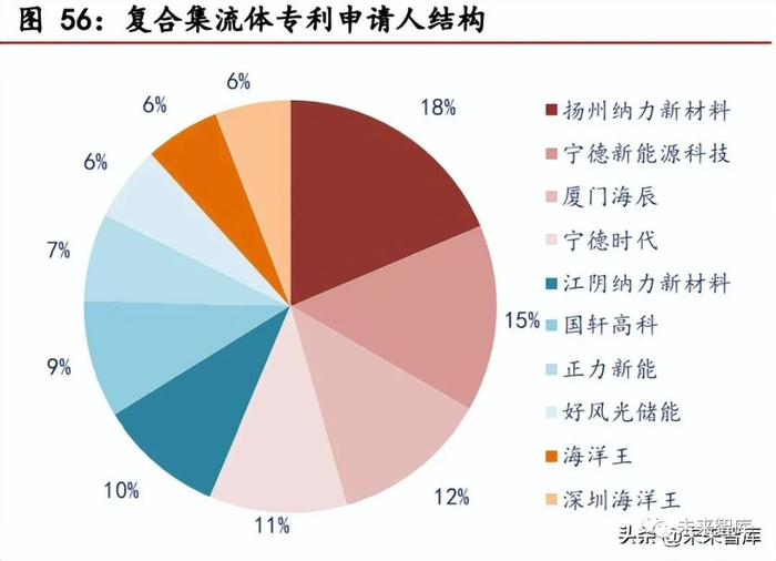 下游锂电和储能等电池厂商积极推进复合集流体产业布局。从专利角度来看,21-22年 为专利爆发期,电池厂商全面布局。整体上,复合集流体专利申请数量从2017年开始呈 现高速增长,2019年进入爆发式增长期,2017-2019年均专利申请数量达;结构上,专利 申请数量由电池厂商占比较多,前四中含有宁德新能源科技有限公司、厦门海辰新能源 可以有限公司、宁德时代新能源科技股份有限公司。