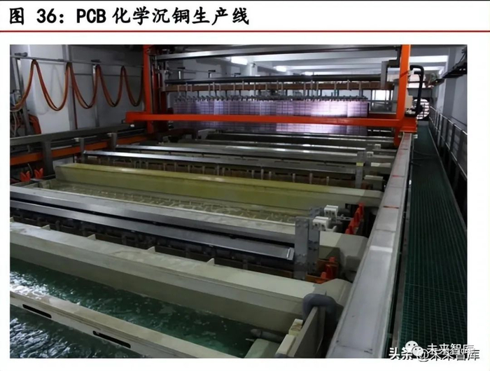 “两步法”“三步法”中所运用到的磁控溅射、真空蒸镀、水电镀等工艺均为物理气相 沉积(PVD),而一步全湿法则为化学液相沉积。化学镀铜工艺主要利用还原剂的氧化 还原反应将溶液中的铜离子沉积在基膜表面,化学沉积过程中无需通电,其主要壁垒在 于化学试剂和相关设备的成本控制。历史上,化学镀铜被广泛应用于有通孔的印制线路 板的生产加工中,其主要目的在于通过一系列化学处理方法在非导电基材上沉积一层铜, 继而通过后续的电镀方法加厚使之达到设计的特定厚度。
