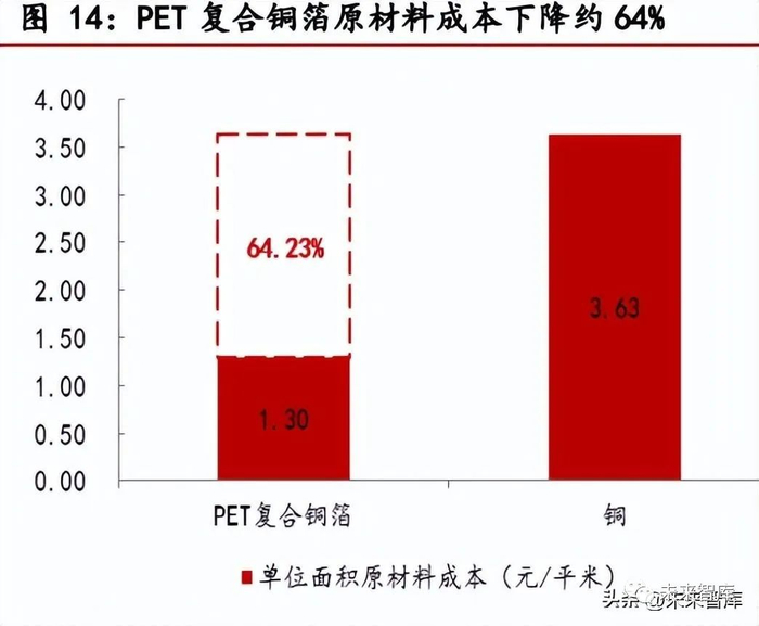相比于传统铜箔,PET复合铜箔的原材料成本可下降64%,单位面积重量可下降68%。由 于PET等基膜成本较低,经测算,6.5微米(4.5微米PET+2微米铜)复合铜箔的原材料成 本为1.3元/m 2,较6微米传统铜箔低64.23%;单位面积重量较传统铜箔下降67.67%。其中, 测算的假设为:1)铜价采取2022年长江有色金属网铜均价,约为6.75万元/吨;PET基膜 价格为0.84万元/吨;2)假设铜靶材价格为铜价两倍,铜靶材溅射的铜厚度为60纳米, 靶材利用率为100%;3)铜和PET的密度分别为8.96g/cm³和1.38g/cm³。