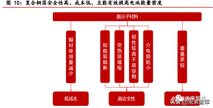 复合铜箔在安全性能、原材料成本以及对电池能量密度提升方面优势明显,契合锂电池 集流体发展方向。复合铜箔使用高分子材料置换传统铜箔中的部分金属铜,高分子材料 相对于铜材,能够有效的增强集流体的韧性与绝缘性,减少金属铜的使用量,进而减小 集流体的厚度与重量,为正负极活性材料提供更多空间。