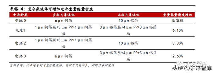 复合铜箔使用低密度的高分子材料置换部分金属铜,能够降低集流体重量和厚度,从而 提升电池能量密度。复合铜箔在保证导电层导电性能和集流性能前提下,一方面,可以 利用高分子材料的韧性等特点减薄集流体厚度,即不影响电池安全性能又能够扩大正负 极活性材料的体积;另一方面能够降低集流体重量,从而提高电池能量密度。根据比亚 迪的实验数据,负极采用 3μm 的基膜+上下各 1μm 铜箔层的复合集流体,电池能量密 度较 6μm 的传统铜箔集流体可提升 3.3%;若正极也采用复合集流体,电池能量密度可 合计提升 6.1%。