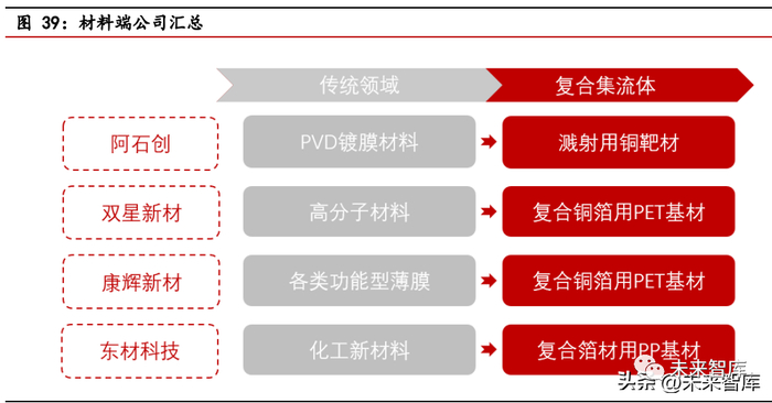 材料端主要包括高分子基膜材料、铜靶材及金属铜等材料。靶材方面,全球靶材市场呈 现寡头竞争格局,但国内外差距正在不断缩小,以阿石创、隆华科技为代表的厂商所生 产的高纯度铜靶材均可用于复合铜箔磁控溅射环节。基膜材料方面,我国呈现低端过剩、 高端短缺的局面,其中高端、特种聚酯薄膜依赖进口;目前国内进展较快的企业有双星 新材、康辉新材和东材科技,在复合铜箔用基材上基本实现了对日本东丽等传统行业龙 头的国产化替代。其中双星新材在开发4.5μmPET材料基础上,正开发3.5μm及以下的PET基材,其强化PET材料已经批量供应客户;康辉新材多条产线具备量产4.5-6μm的PET 复合铜箔用基膜能力,已通过多家下游厂商的前期验证;东材科技是国内极少数的老牌 光学级薄膜细分龙头,最薄BOPP膜可达2.5微米,研发生产能力覆盖4μm的PP基材。