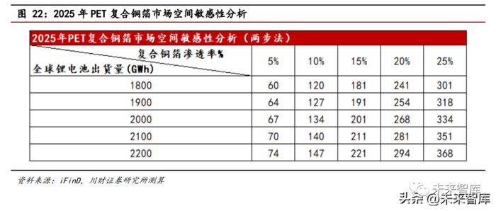 复合铜箔渗透率提升,未来市场空间广阔。我们基于2025年复合铜箔渗透率和全球锂电 池出货量对PET复合铜箔市场空间进行敏感性分析,假设2025年复合铜箔渗透率的区间 跨度为5-25%,全球锂电池出货量区间跨度为1800-2200GWh。随着未来设备技术逐步成 熟,渗透率有望加速提升,若2025年复合铜箔渗透率提升至20%,全球锂电池出货量达到 2000GWh,则2025年PET复合铜箔市场空间有望达到268亿元。
