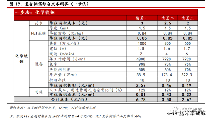 两步法关键假设:1) 情景一:实现小规模生产(产能利用率为70%),良率达到80%的情况。1、工作时间:工作天数为300天/年,工作时间为16小时/天,年小时数为4800小时。2、磁控溅射设备:假设设备价格为1500万元/台,宽幅为1.3米,线速为13米/分钟。3、水电镀设备:假设设备价格为1000万元/台,宽幅为1.2米,线速为8米/分钟。4、人工和其他费用:以铜冠铜箔、嘉元科技2021年成本占比的均值为例,人工和其 他费用比例约为16%。考虑到复合铜箔技术为新型技术,其人工及制造费用较高,因 此假设其他费用比例为19%。2) 情景二:实现规模化量产(产能利用率为80%),良率达到85%的情况。1、工作时间:工作天数为330天/年,工作时间为24小时/天,年小时数为7920小时。2、磁控溅射设备:假设设备价格为1200万元/台,宽幅为1.3米,线速为15米/分钟。3、水电镀设备:假设设备价格为800万元/台,宽幅为1.2米,线速为10米/分钟。3) 情景三:实现规模化量产(产能利用率为90%),良率达到90%的情况。1、磁控溅射设备:假设设备价格为1000万元/台,宽幅为1.3米,线速为20米/分钟。3、水电镀设备:假设设备价格为600万元/台,宽幅为1.2米,线速为12米/分钟。