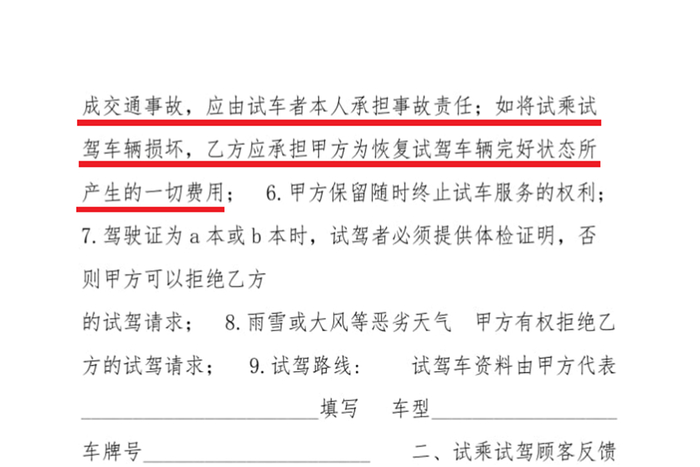 4S店方面应该会马上拿出一份文件,就是你在试驾前签的声明书,上面写着“在试驾过程中,将严格遵守行车驾驶的一切法规和要求”“因此造成对销售公司的一切损失和危害,将由本人全部独自承担和赔偿”等内容,反正意思就是,由于你已经签字确认条款,然后开车又是你,所以一般人看到这文件,大概率会选择老老实实承担全部的修车和贬值费用。