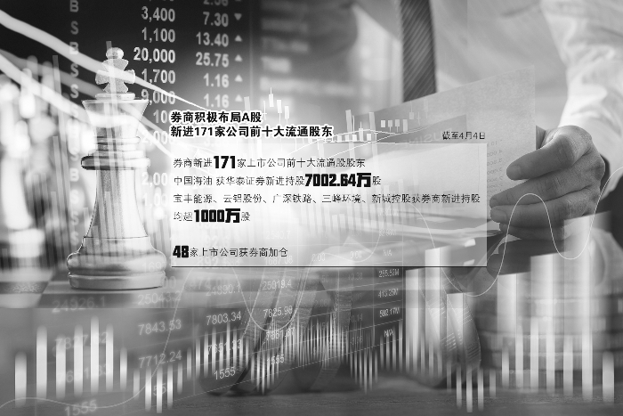 具体来看,券商去年四季度新进171家上市公司,其中中国海油的新进股份数量居首,华泰证券新进持股数量达7002.64万股。此外,宝丰能源、云铝股份、广深铁路、三峰环境、新城控股等5家公司新进股份数量均超1000万股。