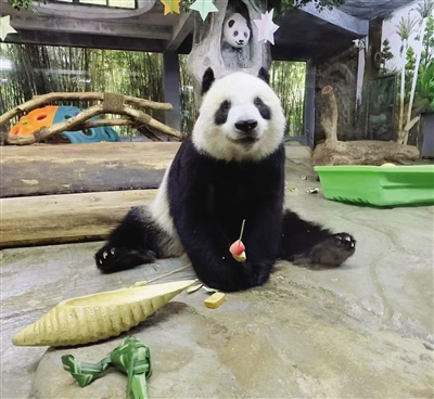 “我们每天要花半个小时为大熊猫做‘营养餐’,胡萝卜等食材都是买最新鲜的,偶尔会喂台湾甜竹或海南本地小青竹,竹笋则是根据季节选择。大熊猫吃的一般是长了2-5年的竹子,竹叶一般是1-2年的嫩竹叶。”