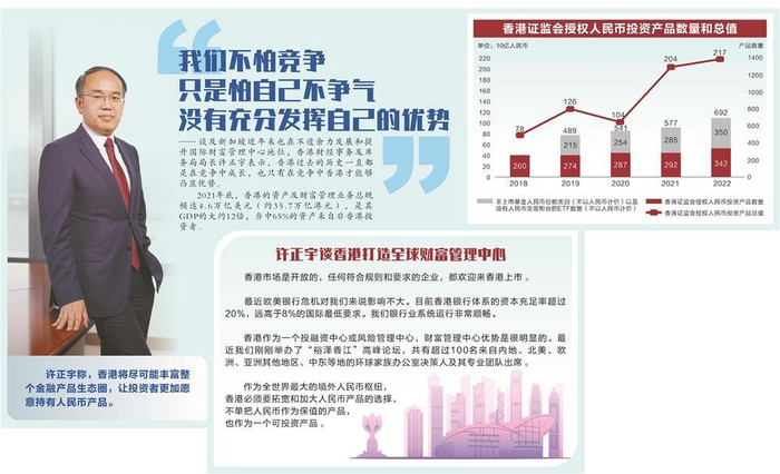 许正宇:香港在2021年年底的资产及财富管理业务总规模达4.6万亿美元(约35.7万亿港元),是其GDP的大约12倍,当中65%的资产来自非香港投资者。
