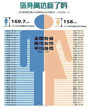 如果说前面这些是个例,毕竟哪里还没几个高个子了,那全国平均数据就是千真万确抵赖不了的铁证了。2020年我国18~44岁男女性的平均身高调查显示,山东省男性平均身高为175.44厘米,女性平均身高为169.45厘米,均位列全国第一,比广西等省份高出10厘米左右。