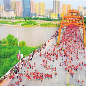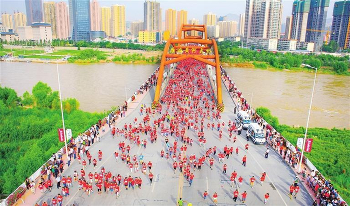 兰州国际马拉松选手经过兰州雁滩黄河大桥。