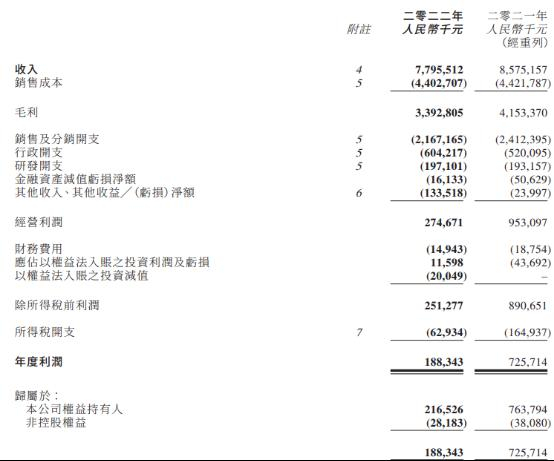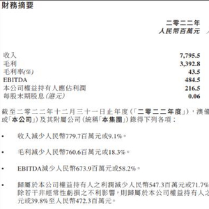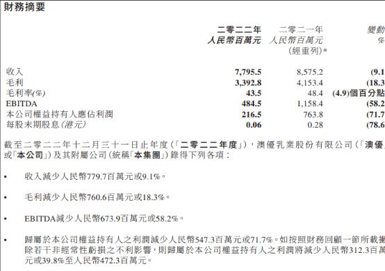 年报显示,2022年,澳优实现收入约77.96亿元人民币(下同),同比减少9.1%;经调整后归属于母公司权益持有人应占利润约4.72亿元,同比减少39.8%;公司权益持有人应占利润2.165亿元,同比减少71.7%。