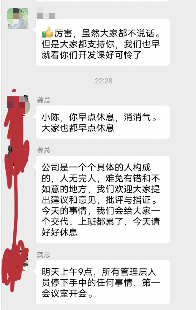 晚上22点28分,龚总发出声音,让陈志龙消气,早点休息。明天早上9点,所有管理层在会议室开会。
