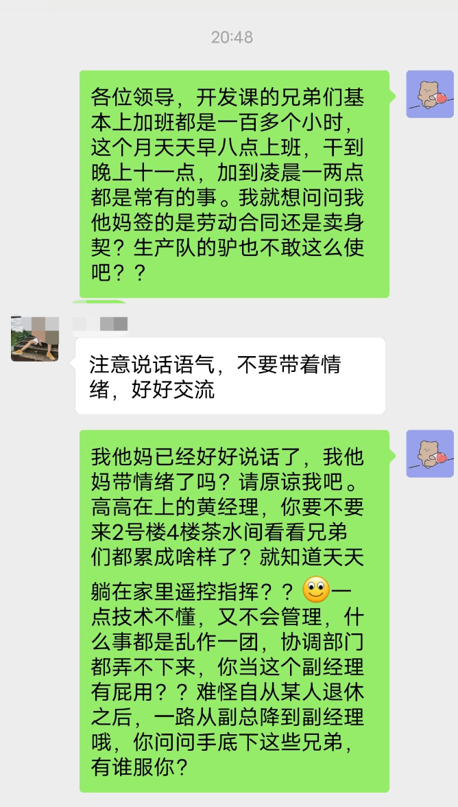 晚上20点48分,成都事业部(413)微信大群,陈志龙表达强烈不满。黄珂林副经理表示不要带情绪,有事情向行政部反馈。