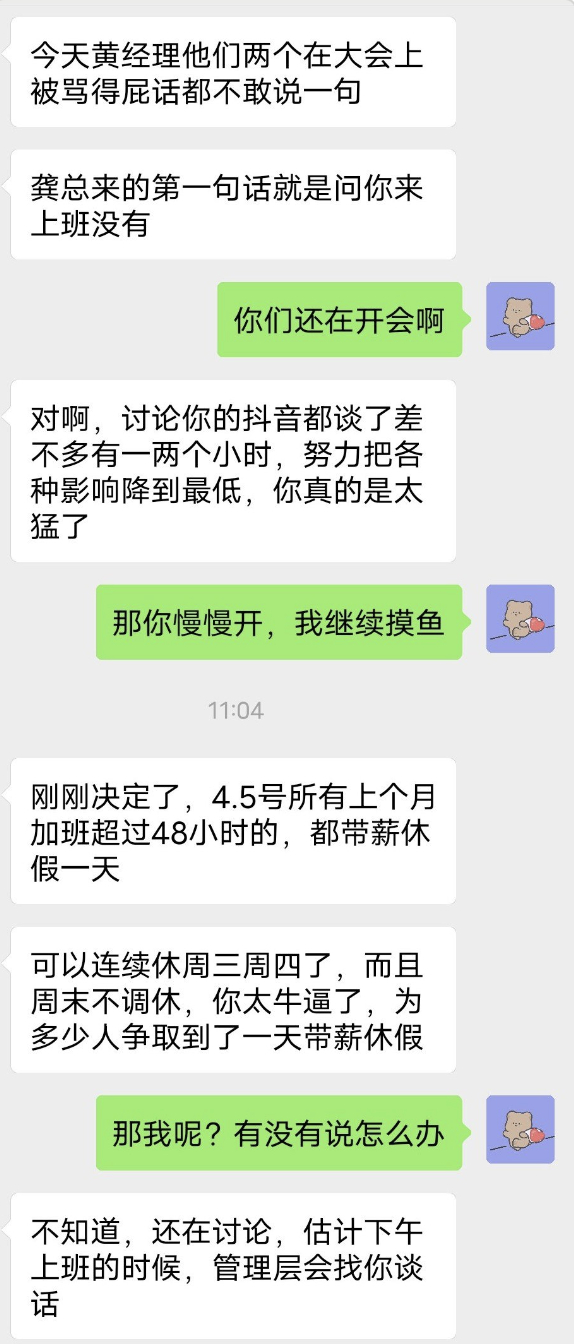 下午15点58分,成都事业部大群,龚总表示3月加班超过48小时的,4月6日带薪休假一天。OA系统上线匿名系统,欢迎员工提意见。
