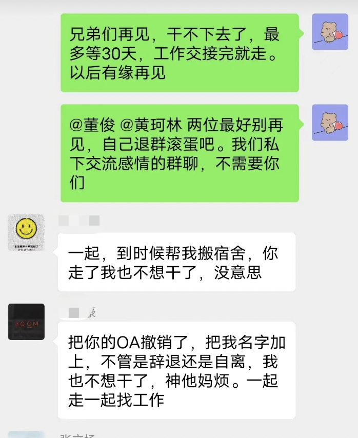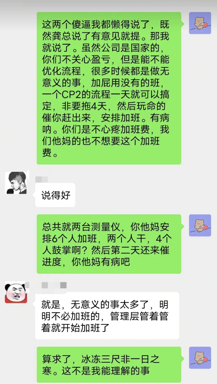 下午19点13分,成都事业部大群,陈志龙表达了对黄珂林的强烈不满,表示太多无意义加班,譬如两台测试仪,安排6个人加班等。陈志龙再次表示辞职。