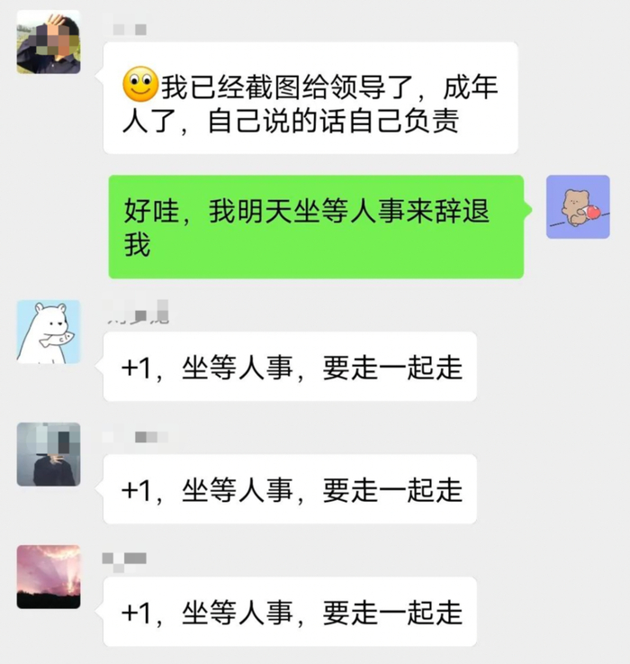 晚上20点23分,对董俊的加班询问,无人回应,于是董俊指定了陈志龙、陈金。陈金表示不去加班,陈志龙强烈表达反对加班。董俊表示已经截图发给领导。陈志龙表示坐等人事辞退,群里的其他同事也支持陈志龙,微信群里接龙表示“要走一起走”。