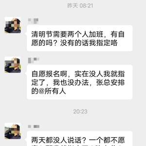 早上8点21分,软件开发课微信群,管理者董俊询问清明节需要两个人加班,有无自愿?如果没有就指定。